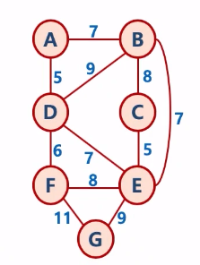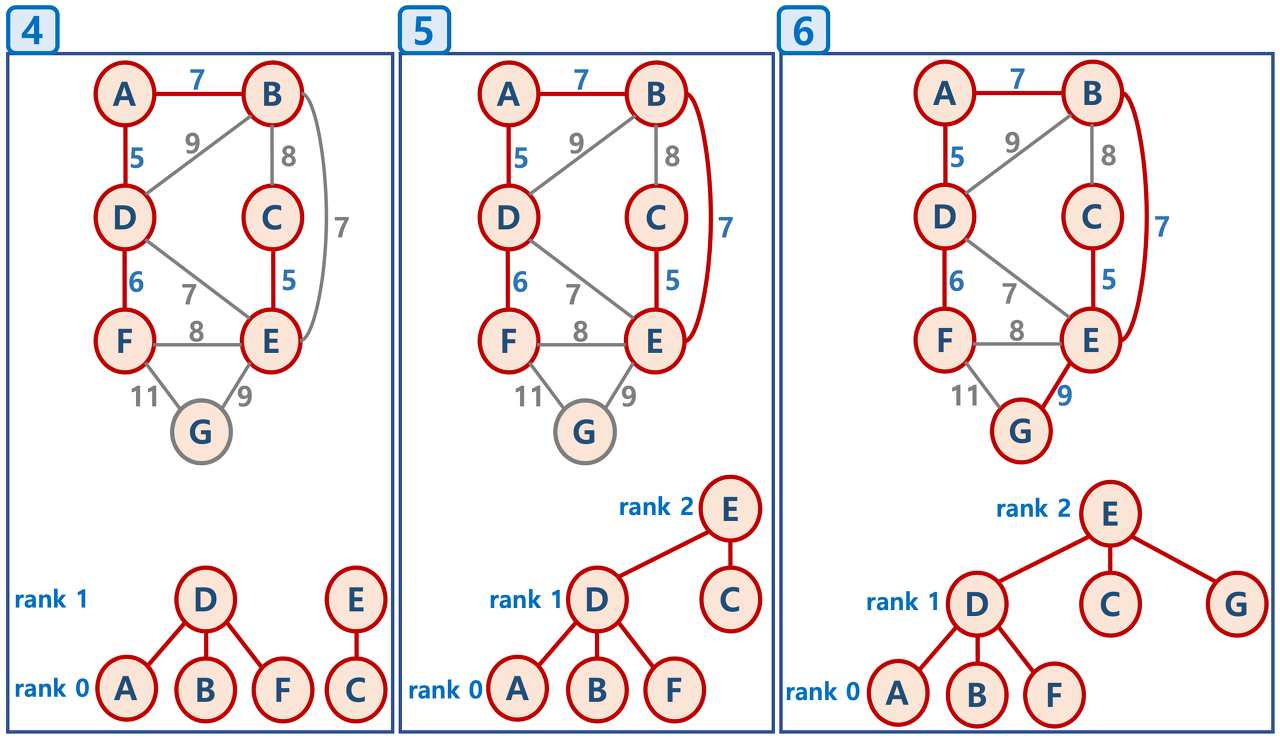 * 간선 [D↔E, 7], [F↔E, 8], [D↔B, 9]을 연결하지 않는 이유는 사이클이 생성되기 때문이다.
