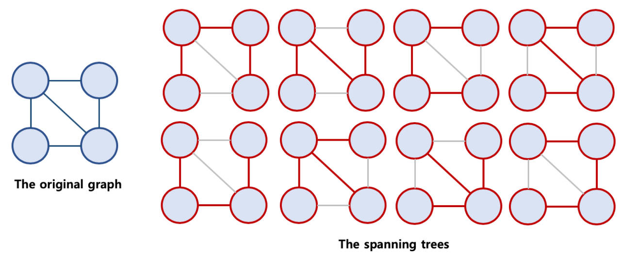 - 그래프 내부의 모든 노드는 연결되어야 한다. (Spanning Tree의 특징)