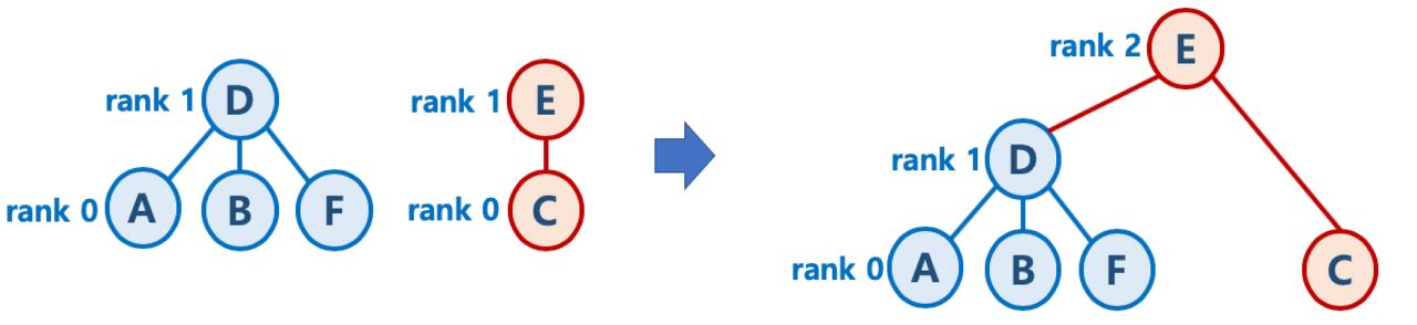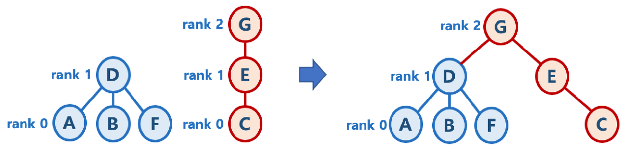 - 각 부분집합인 트리의 높이(rank)를 저장하여 Union 작업을 할 때, 2개의 트리(부분집합)의 높이가 다르면 높이가 작은 트리를 높이가 큰 트리에 연결하는 방식이다. 즉, 높이가 큰 트리의 루트노드가 합쳐졌을 때의 새로운 루트노드가 되게 한다. (아래 사진참고)