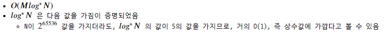 - 위의 사진에서 설명하는 시간복잡도에 대한 결론은 다음과 같다. N이 무한대에 가까운 값을 가져도, 이는 상수에 가까운 값으로 계산되기 때문에 union-by-rank와 path compression 기법을 사용하면 O(1) 만큼의 시간복잡도를 갖는다.