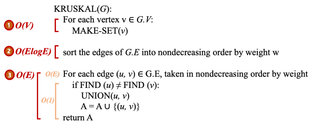 - 여기서 E는 Edge를 의미한다. 간선의 개수만큼 시간복잡도가 계산된다. - 3단계 - 2개 부분집합 각각의 루트노드를 확인(find)하고 서로 다른 경우 union한다 → O(1)