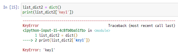 - 위의 사진과 같이, 딕셔너리 자료구조를 초기화하지 않은 상태에서는 특정 key 또는 value를 호출하면 오류가 발생한다.