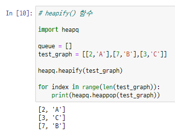 - 위의 코드를 살펴보면, for 반복문을 이용하여 그래프(test_graph)에 들어있는 간선의 정보를 heappush() 함수를 이용하여 하나씩 삽입하는 것을 볼 수 있다. 하지만 이와는 다르게, 코드의 효율성을 높이기 위해, 데이터 삽입 작업을 한번에 할 수 있는 함수가 존재한다.