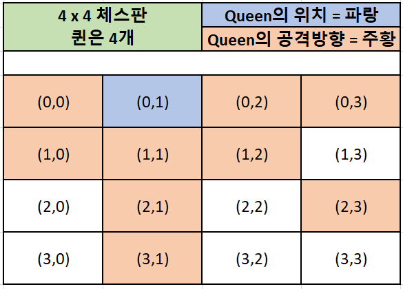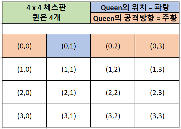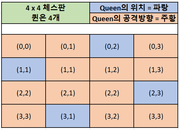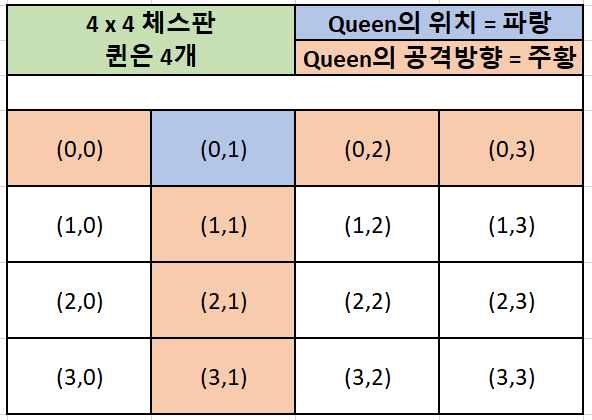 - 조건 1) N x N 크기의 체스판에서 N개의 Queen이 존재한다. ex) 4 x 4에서는 4개의 퀸