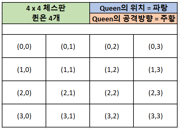 - 만약 4x4 크기의 체스판이 있다고 생각해보자.(아래 사진참고)