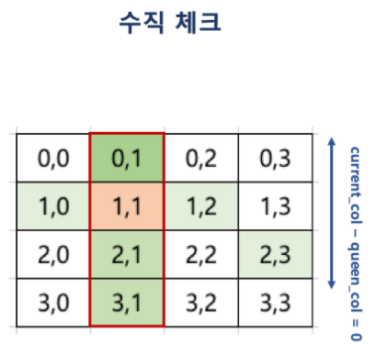 - 수직으로 움직이는 Queen의공격을 피하기 위해서, 열이 겹치만 안된다.