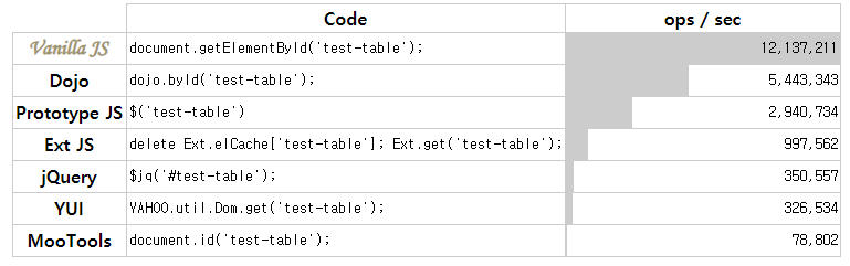 - 위의 사진에서 보이는 jQuery, Dojo 등의 다양한 라이브러리는 Vanillna JS를 다른 코드형식으로 복제할 뿐이며, 기존의 Vanilla JS와 비교했을 때, 연산처리속도 또한 매우 느린것을 확인할 수 있다.