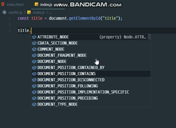 - 그러므로 document.getElementById("title") 이라고 하면, 해당 JS파일이 연결되어 있는 HTML에서 title이라는 id를 갖고있는 엘리먼트를 선택한다는 의미가 되는 것이다.