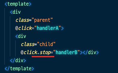 - 자식 엘리먼트에 stop 이벤트 수식어가 적용되면 자식 엘리먼트에 걸려있는 이벤트 핸들러만 동작하게 된다.