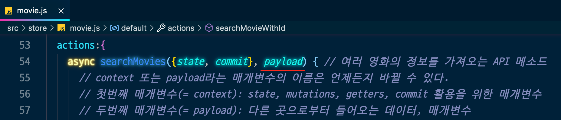 - searchMovieWithId() 메소드에서 Movie.vue로부터 전달받은 데이터를 payload에 담는다.