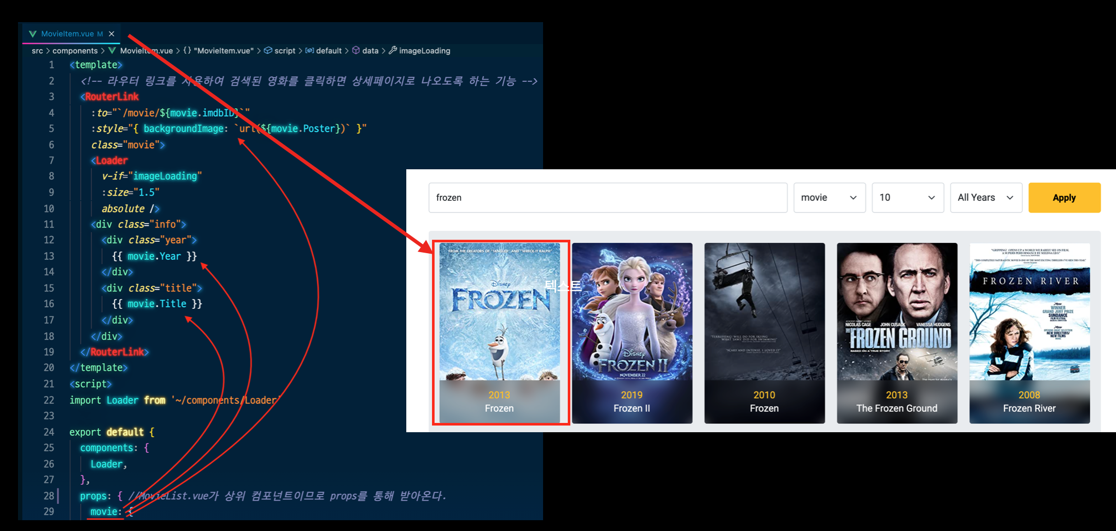 - 각 MovieItem.vue가 MovieList.vue 안에서 영화 포스터를 출력하게 된다.