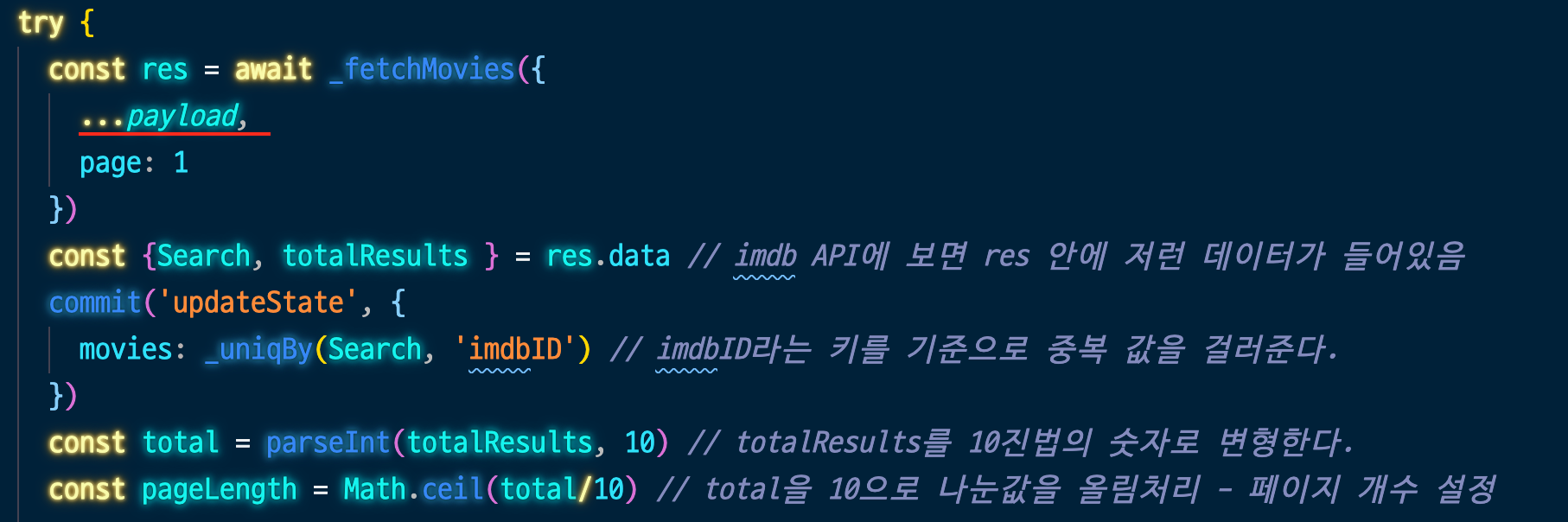 - res를 객체구조분해를 사용하여 필요한 데이터만 store의 'movie'모듈의 movies라는 state에 저장한다.