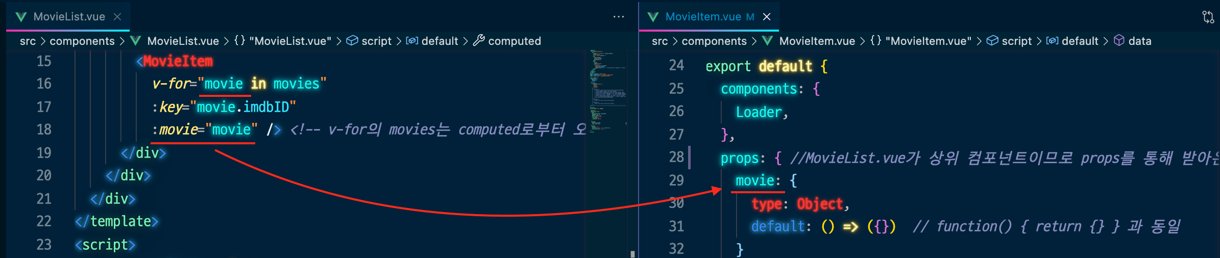 - MovieList.vue에서 넘어온 movie 객체를 props 옵션을 통해 MovieItem.vue에서 받아온다.