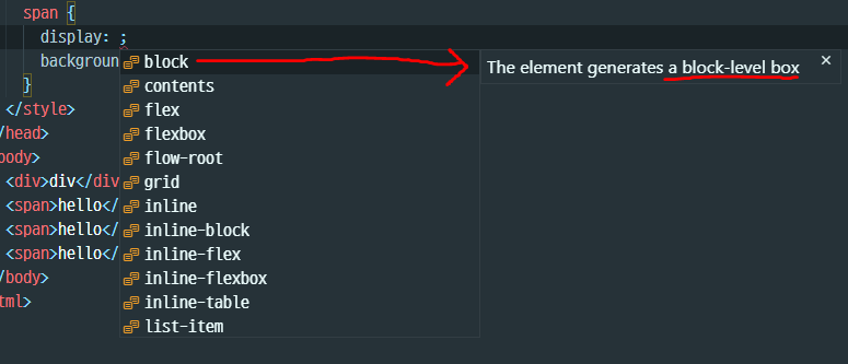 - 위의 사진과 같이 display속성을 보면 다양한 값들이 존재한다. 그 중에 block이라는 값의 설명을 보면 "The element generates a block-level box" 즉, block형태의 요소로 만들어 준다고 한다.