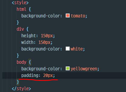 - 위의 사진을 보면, 상하좌우에 padding 20px를 적용하였고 이전에는 공유했던 div와 body의 상하경계에 간격이 생긴것을 볼 수 있다. 이와 같이 padding은 margin가 반대로 내부의 간격을 의미한다.