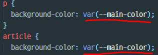 - 위와 같은 코드가 있을 때, 엘리먼트의 색상을 바꾸려면 div, p, article태그에 적용된 배경색을 하나씩 바꿔야 한다. 하지만, CSS변수를 사용한다면 쉽게 색상을 변경할 수 있다.