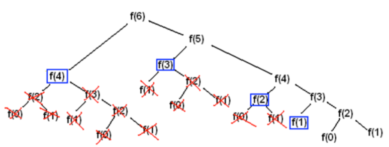 - 위의 식처럼 상위 값을 구하기 위해 하위 값을 계산하는 방식이다. 이를 바탕으로 f(1)부터 f(6)까지 모든 값에 대하여 동적 계획을 실행한다면 두번째 사진과 같이 트리구조로 표현할 수 있으며, 부분 문제에서 중복되는 연산이 발생하는 것을 볼 수 있다. ex) f(3), f(2), f(1)