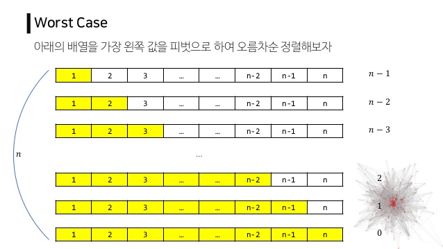 - 다만, 맨 처음 결정되는 pivot이 가장 크거나 작은 데이터라면 모든 데이터와 비교하는 최악의 상황으로, O(n^2)의 시간복잡도를 갖는다.