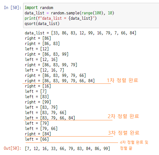 5. return quicksort(left) + pivot + quicksort(right) 로 재귀 호출