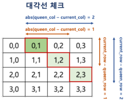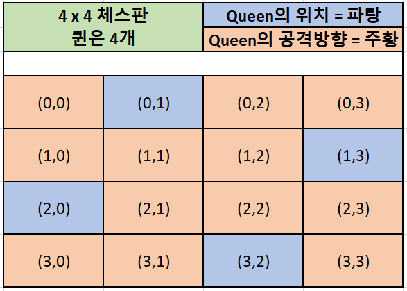 - 조건 1) N x N 크기의 체스판에서 N개의 Queen이 존재한다. ex) 4 x 4에서는 4개의 퀸